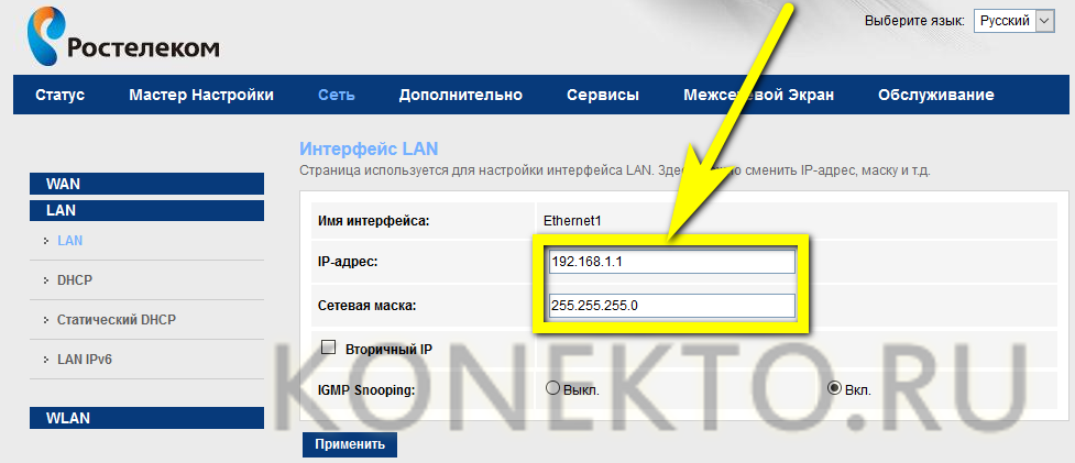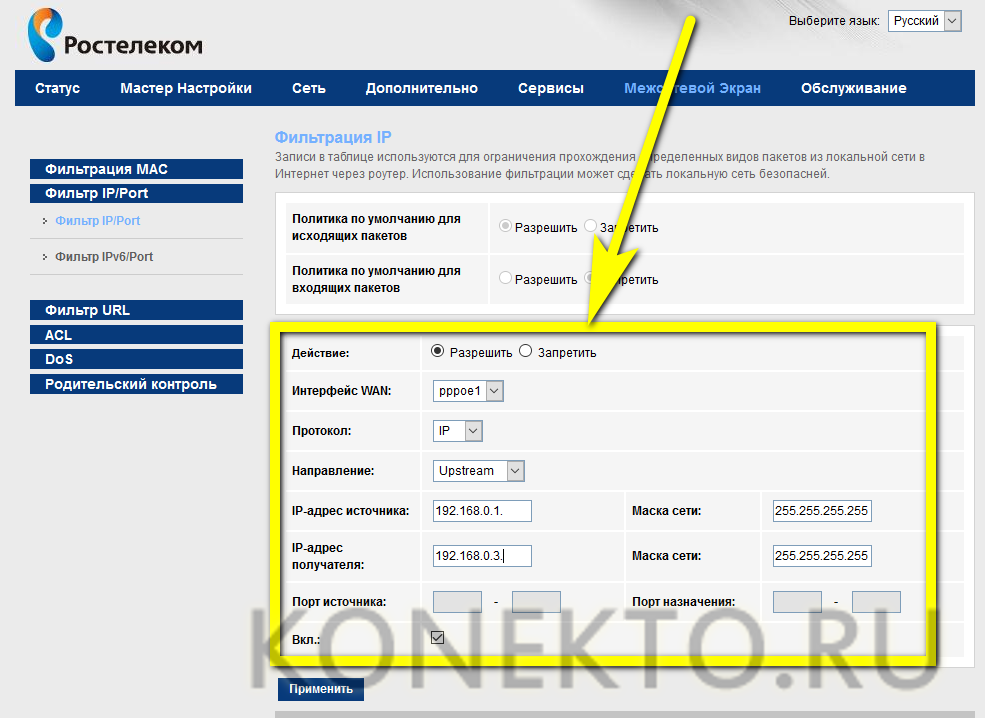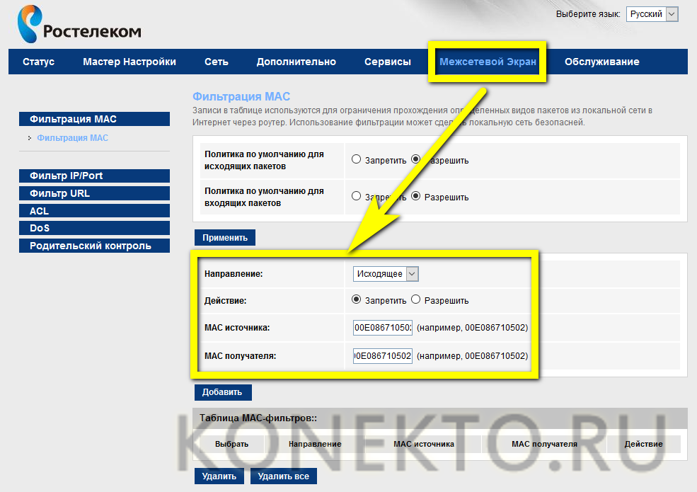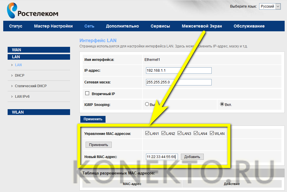 И задать адрес сетевой карты — для роутера Ростелекома в целом или для каждого выхода в отдельности.
