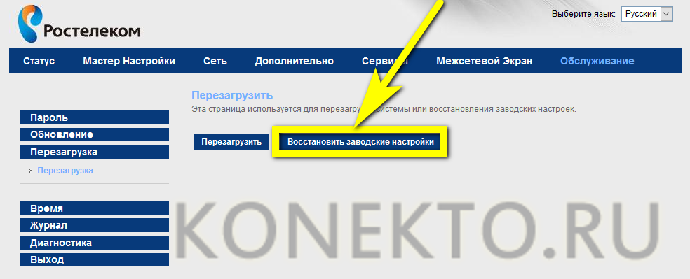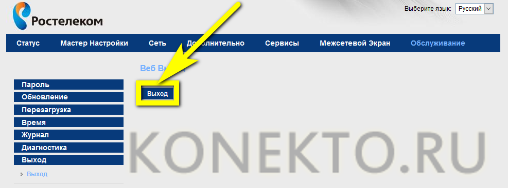 Завершив с ручной настройкой роутера от Ростелекома, можно закрыть окно; для этого достаточно перейти на вкладку «Выход» и нажать на одноимённую кнопку.
