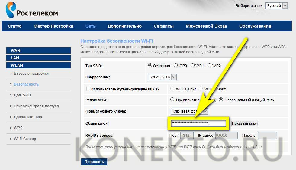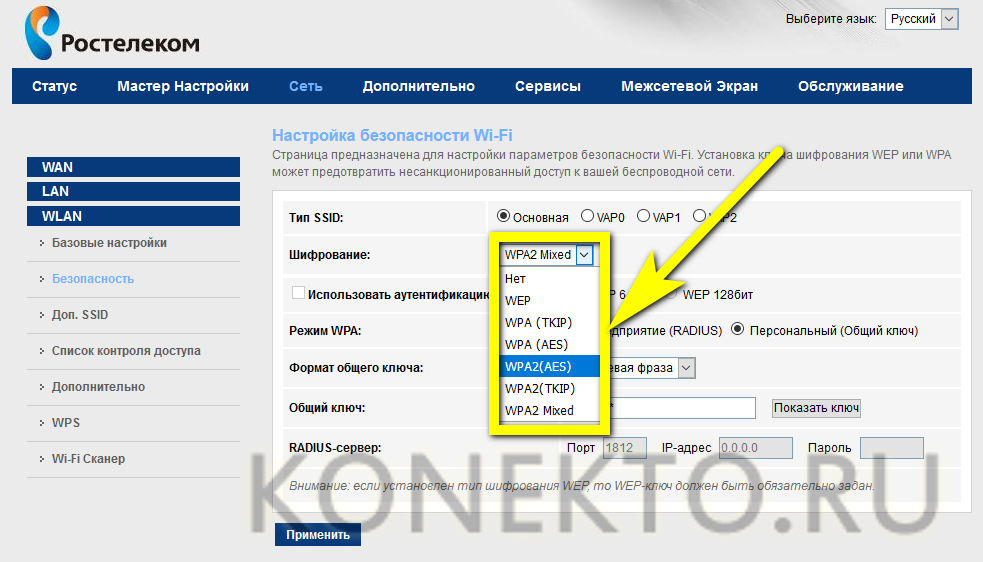 На вкладке WLAN «Безопасность» — установить способ шифрования доступа к сигналу Wi-Fi.