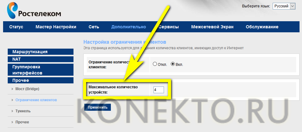 На вкладке «Ограничение клиентов» — указать, сколько устройств может одновременно подключаться к роутеру.