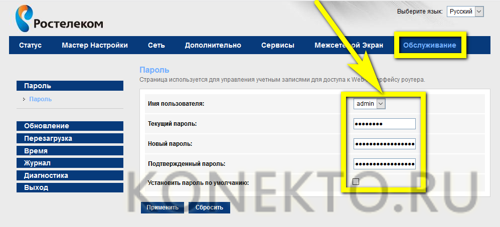 В разделе «Обслуживание» хозяин роутера с лёгкостью сменит имя и пароль администратора.