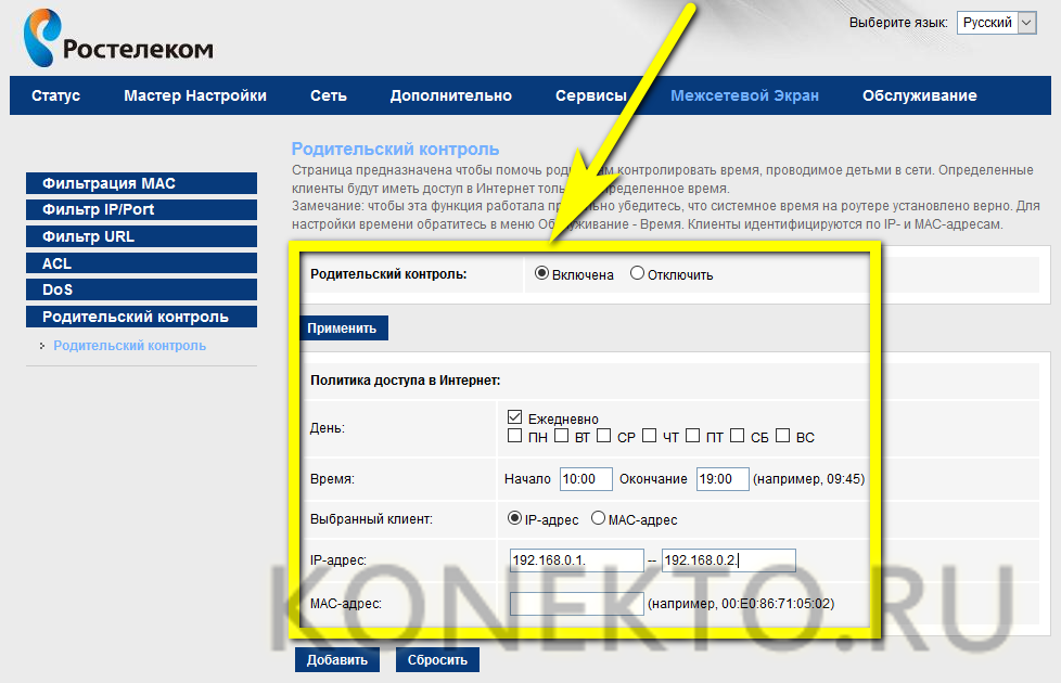 А в «Родительском контроле» — определить, должен ли работать роутер Ростелекома по определённому расписанию.