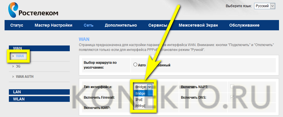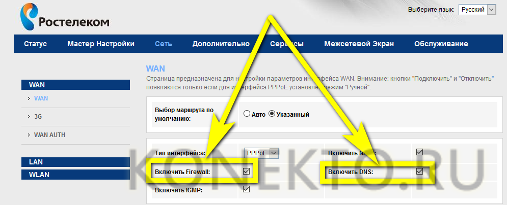 Для обеспечения доступа абонентов в сеть, провайдер Ростелеком чаще всего использует стандарт PPPoE. Его параметры устанавливаются в разделе WAN меню «Сеть».