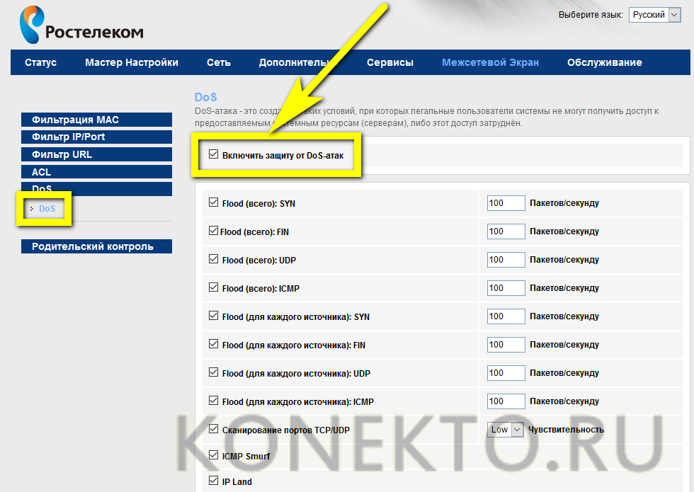 На вкладке DoS того же раздела следует включить защиту от массовых атак — особенно это актуально для владельцев серверов.