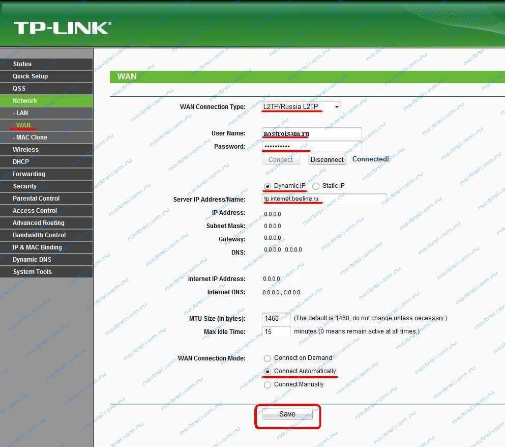 Для подключения беспроводного маршрутизатора TP-Link к Домашнему Интернету Билайн, надо тип WAN подключения — «WAN Connection Type» — выбрать «L2TP/Russian L2TP».