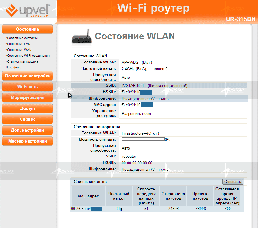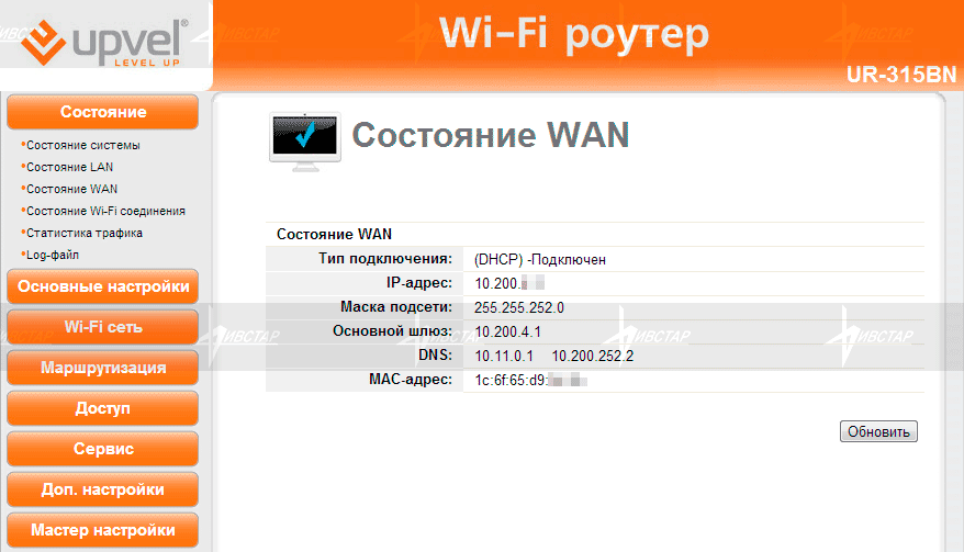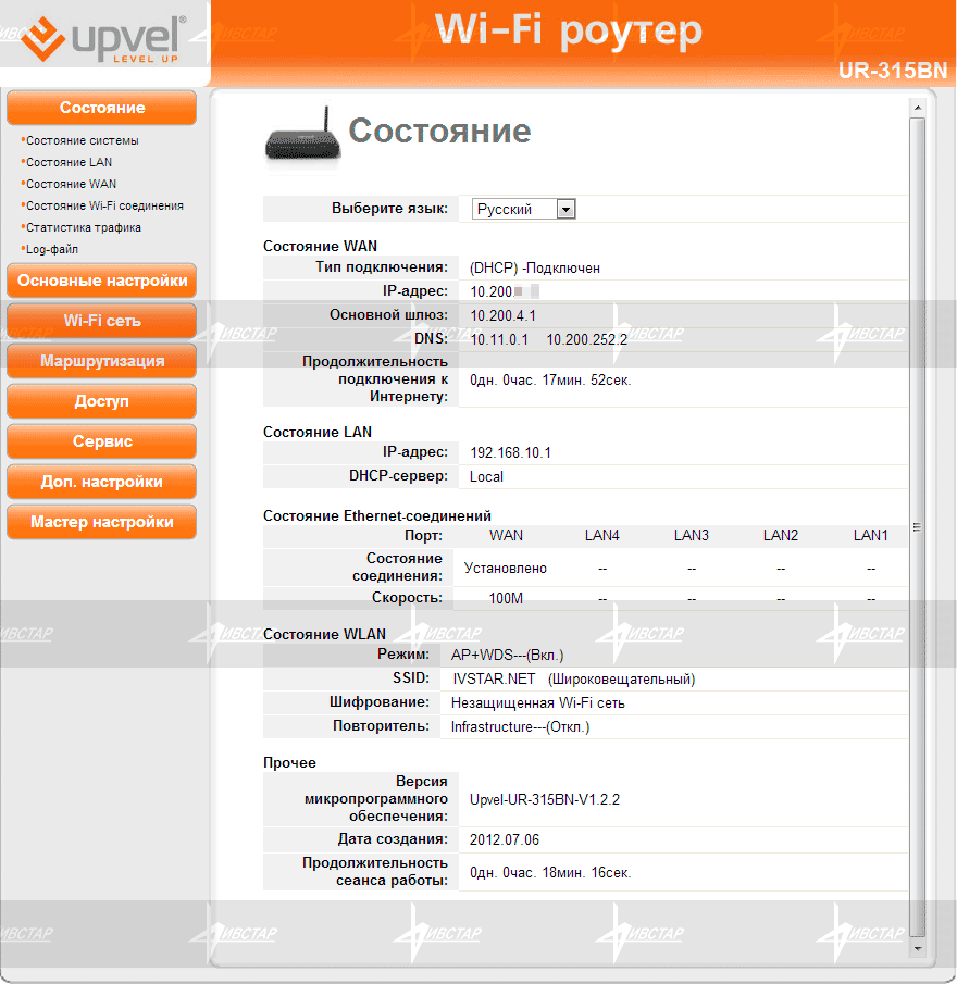 После входа в систему настроек роутера вы попадаете на главную страницу, где отображается сводная информация о текущем состоянии роутера. В разделе Состояние WAN отображается тип установленного соединения и полученные или настроенные IP-адреса. На приведенном примере отображается состояние роутера в сети Ивстар, где задан тип подключения DHCP (получать адреса автоматически). В разделе Состояние WLAN отображается название вашей беспроводной сети (SSID), наличие пароля к ней (Шифрование). Кроме всего, здесь отображается версия программного обеспечения (прошивки) роутера UPVEL UR-315BN и продолжительность работы роутера с момента последнего включения в розетку. На главной странице вы всегда сможете проконтролировать верно ли настроен ваш роутер. В меню Состояние — Состояние LAN и Состояние WAN можно более подробно увидеть текущие настройки локальной сети и подключения к интернету.