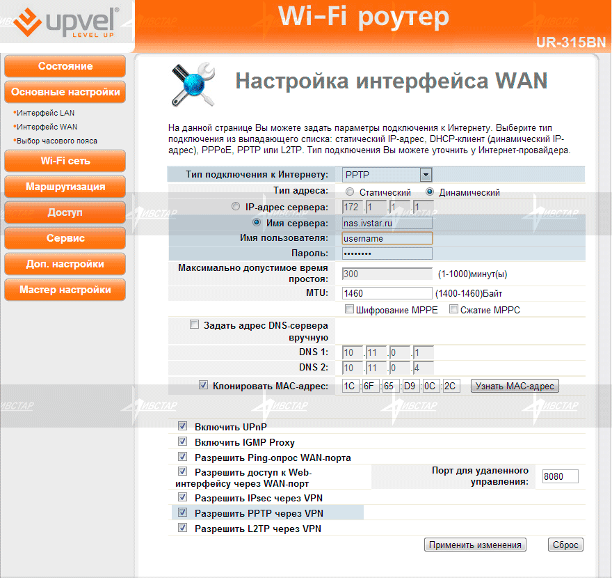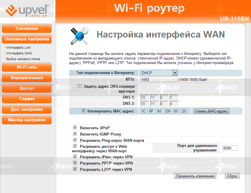 Переходим в левом столбце меню в раздел Основные настройки — Настройка интерфейса WAN. именно в этом разделе происходят настройки соединения роутера UPVEL UR-315BN с интернетом. Пользователи сети Ивстар здесь ничего менять не должны: тип подключения к интернету должен быть таким как то выставлено производителем, т.е DHCP. Если вы выходите в интернет через телевизионный кабельный модем и роутер приобрели позже чем вас подключили к интернету, вам может понадобиться настройка MAC-адреса в этом окне ниже. Поставьте галочку рядом с опцией Клонировать MAC-адрес и нажмите кнопку Узнать MAC-адрес чтобы скопировать его с сетевой карты вашего компьютера или ноутбука который подключался изначально при установке интернета в квартире. Рекомендуем отметить галочками опции Разрешить ping-опрос WAN-порта и Разрешить PPTP через VPN. Первая опция позволит вашему провайдеру проверять доступность вашего роутера с его серверов, а вторая позволит устанавливать VPN подключения по логину и паролю.