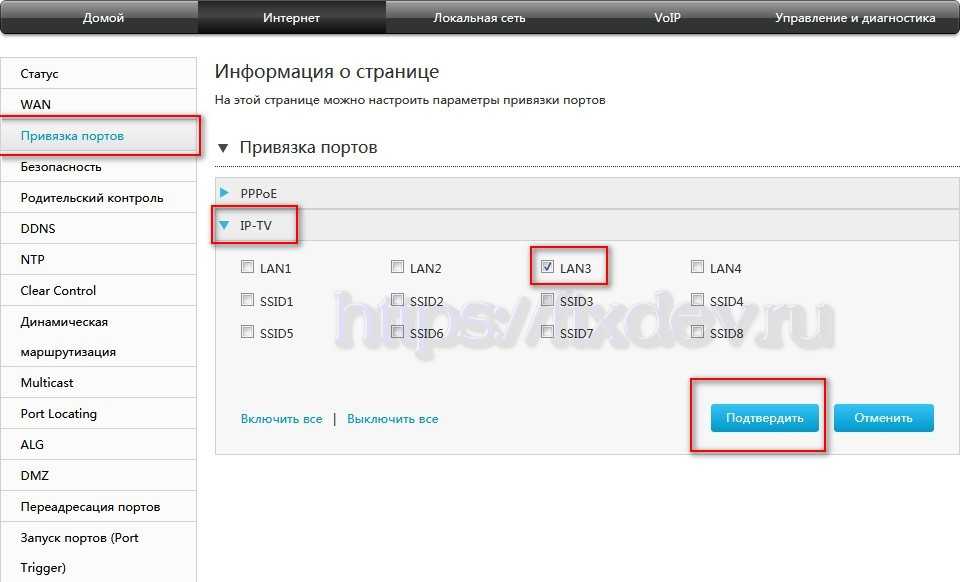В нем производится программное назначение коннекторов LAN1-LAN4. Для PPPoE по умолчанию выбраны порты LAN1-LAN3. К ним будут подключаться компьютеры. Для IPTV надо назначить LAN4. К нему будет включена ТВ-приставка, которая будет использовать его по Ethernet-кабельной линии. После установки галочек в выбранных клетках нажмите кнопку «Сохранить настройки и подтвердить».