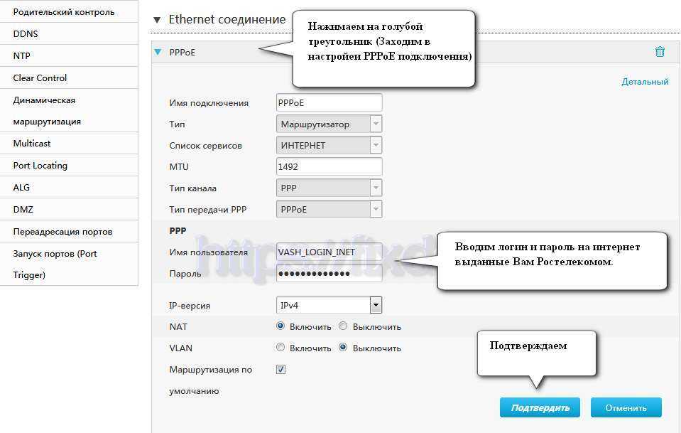 Нажимаем на голубой треугольник слева от «PPPoE». В поля имя пользователя и пароль вводим логин и пароль для услуги интернет (PPPoE) который Вам предоставил Ростелеком. Обычно он указан в договоре на услуги связи. После чего нажимаем кнопку «Подтвердить».