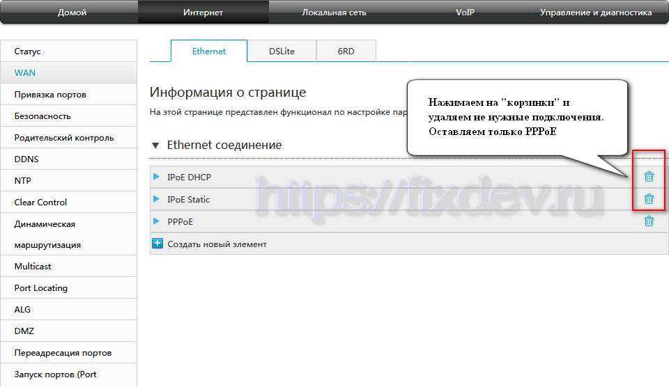 Открываем в меню раздел «Интернет» слева выбираем «WAN». Здесь удаляем не нужные подключения «IPoE DHCP» и «IPoE Static», а PPPoE оставляем.
