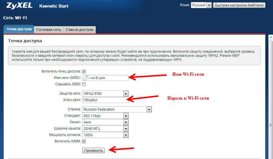 Теперь непосредственная пошаговая настройка роутера Zyxel Keenetic Start – WiFi. Настраивать не так долго осталось. Переходим во вкладку «Wi-Fi сеть». Здесь ставим галочки и делаем так же, как и на скриншоте. SSID –это название вашего вай фая «Зиксель Кинетик Старт». Ключ – это пароль от него. Заполняем и жмем применить.