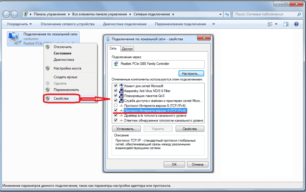Там мы кликаем правой кнопкой мыши на подключение по локальной сети Ethernet, чтобы вызвать контекстное меню. Выбираем пункт «Свойства». Откроется окно настроек адаптера:
