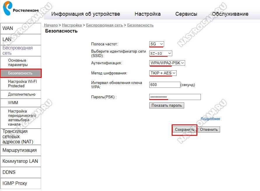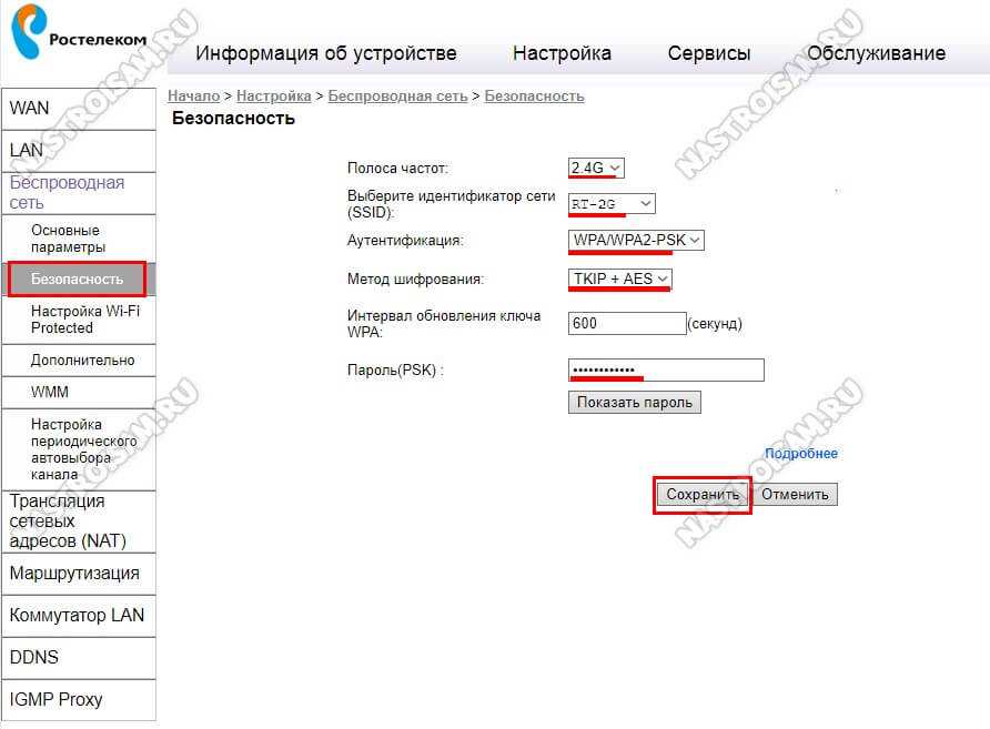 Здесь ставим так же стандарт WPA2-PSK с шифрованием AES и меняем пароль Wi-Fi. Нажимаем кнопку «Сохранить».