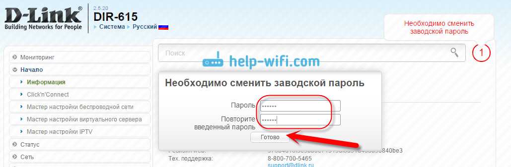 Откроется панель управления рутером, и сразу появится окно, в котором нужно два раза указать новый пароль, который в дальнейшем будет использоваться для входа в настройки (вместо admin)