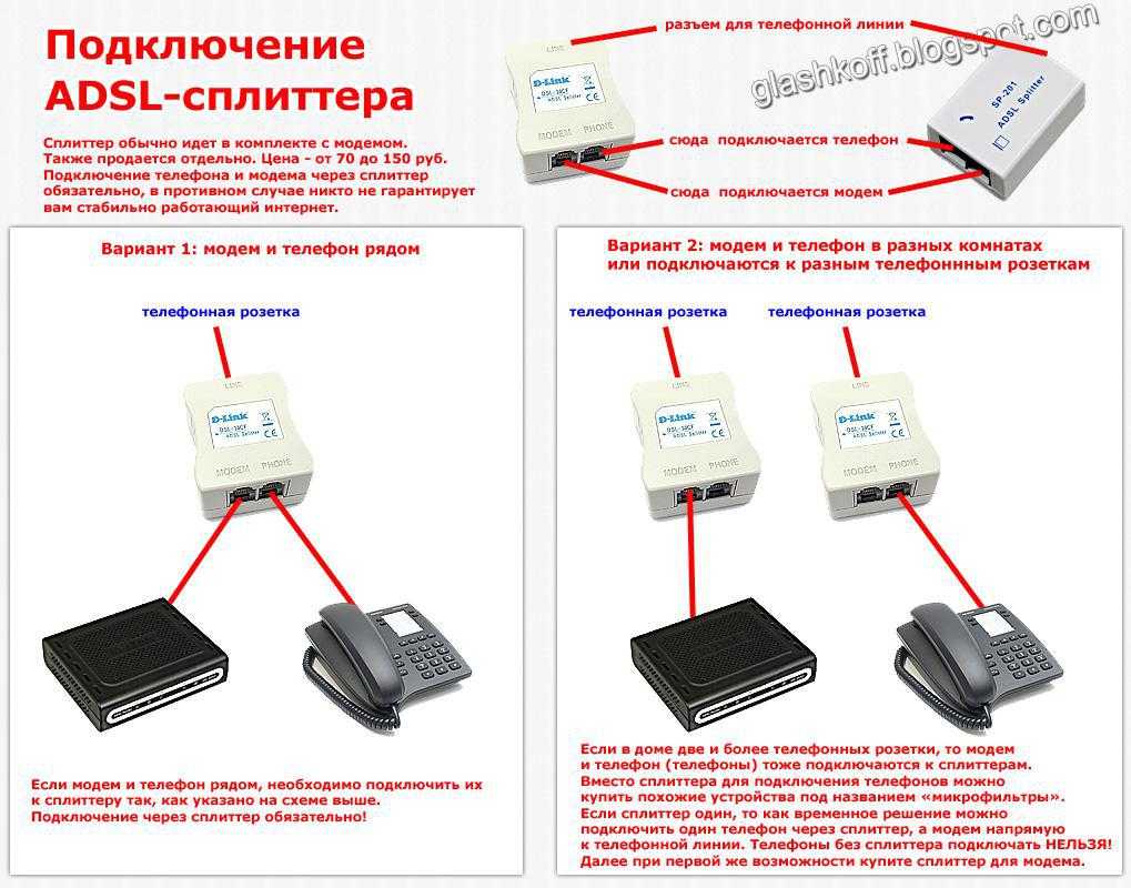 Чтобы не было шумов при поднятии трубки телефона, чтобы интернет работал стабильно и быстро, необходимо подключить сплиттер. Это коробочка, фильтрующая сигнал отдельно для модема и отдельно для телефона. Нажмите на картинку ниже, там я нарисовал два варианта подключения сплиттера: