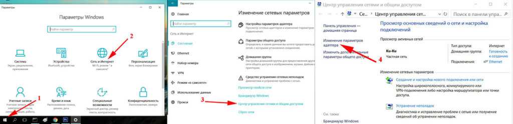 После проверки проводов, если нет интернета, необходимо убедиться включено ли сетевое подключение. Заходим в «Пуск», «Параметры» дальше «Сеть и Интернет» находим строку «Центр управления сетями и общим доступом», «Изменение параметров адаптера».