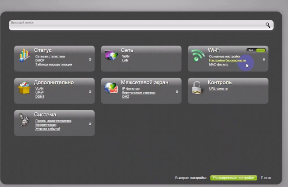 - После выполнения входа вы попадете на вкладку быстрых настроек роутера. Меню настроек отличается, в зависимости от модели маршрутизатора. В некоторых случаях оно может быть представлено на английском языке;