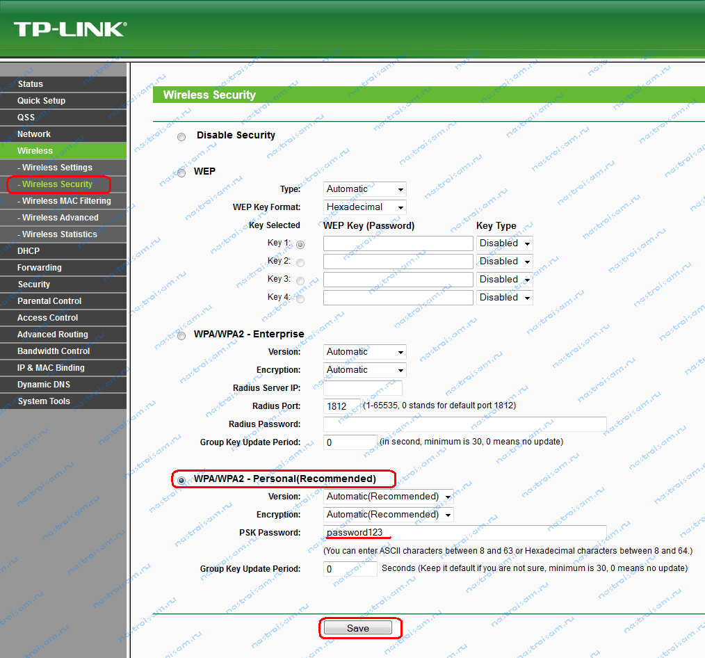 Тип спецификации выбираем «WPA/WPA2-Personal». В списке «Version» желательно выбрать «WPA2-PSK». Если у Вас в сети используются различные мобильные устройства с WiFi, тогда ничего не меняем и оставляем «Automatic». В поле «PSK Password» прописываем ключ безопасности создаваемой беспроводной сети. Им может быть любая буквенная или цифирная последовательность не короче 8 символов. Нажимаем кнопку «Save».