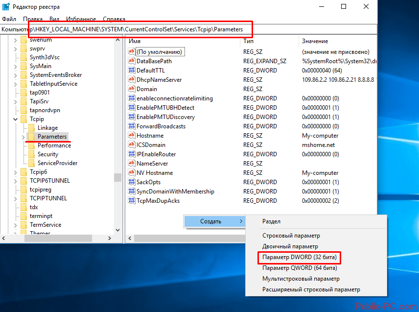 - Находим раздел HKEY_LOCAL_MACHINE\SYSTEM\CurrentControlSet\Services\Tcpip\Parameters. Жмём правой кнопкой мыши на пустом месте и выбираем «Создать параметр DWORD (32 бита)». Задаем параметру название «EnableRSS» и значение «0».