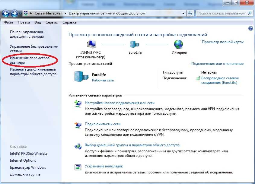 В открывшемся окне выбрать пункт «Изменение параметров адаптера».