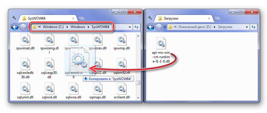 Скачать файл api-ms-win-crt-runtime-l1-1-0.dll также можно вручную со специальных сайтов в сети, которые дают возможность загружать недостающие библиотеки. После скачивания потребуется переместить файл в системную папку в соответствии с разрядностью установленной на компьютере системы. Для 32-х битной Windows адрес будет: