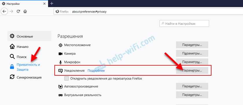 Нужно зайти в «Меню» – «Настройки». Перейти на вкладку «Приватность и защита», прокрутить страницу до раздела «Уведомления» и нажать на кнопку «Параметры» напротив соответствующего пункта.