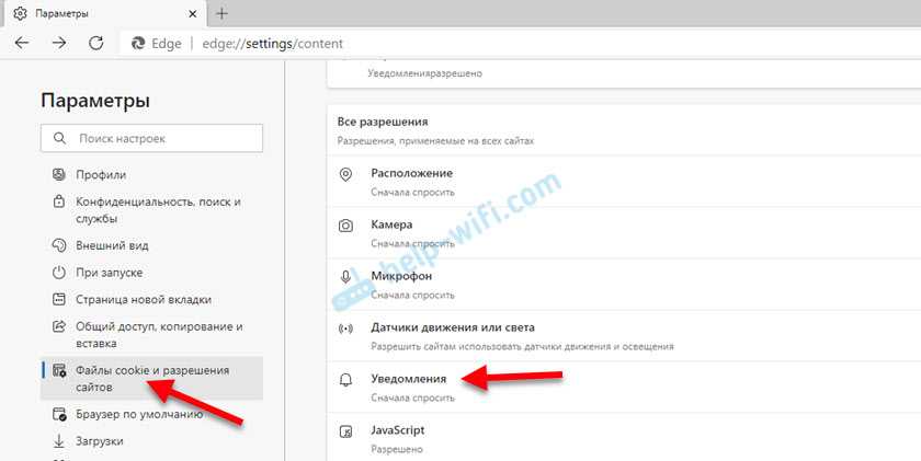 Нажмите на меню из трех точек и выберите пункт «Настройки». Слева перейдите в раздел «Сохраненные файлы cookie и данные» и нажмите на пункт «Уведомления».