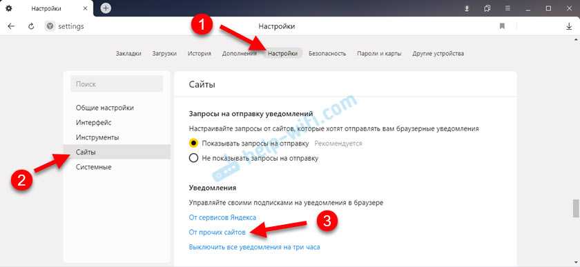 Открываем «Меню» – «Настройки». Дальше переходим на вкладку «Сайты» и нажимаем на пункт «От прочих сайтов» в разделе «Уведомления». Ссылка для быстрого доступа к настройкам: browser://settings/content/notifications (скопируйте в браузер и перейдите по ней).