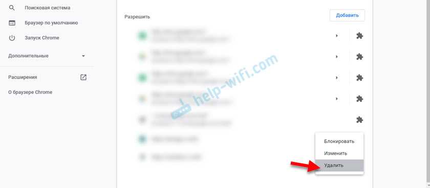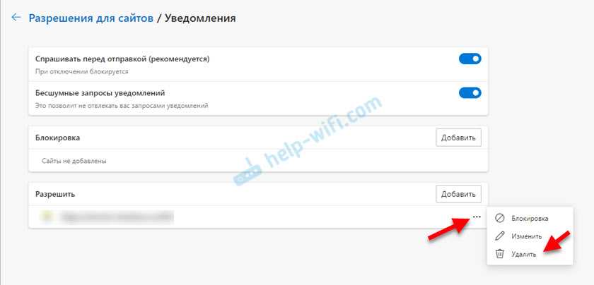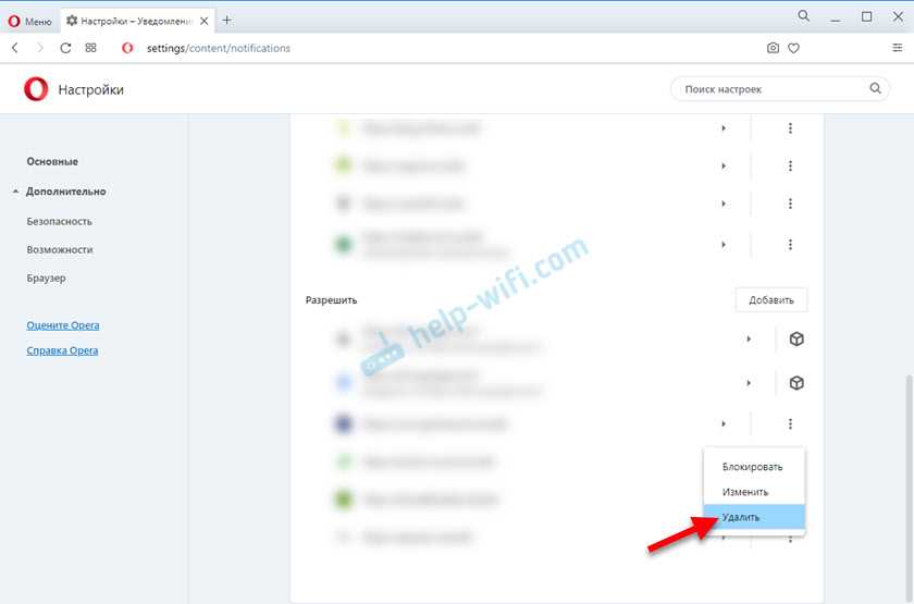 Удалите все сайты в разделе «Разрешить». Или только те сайты, от которых вы хотите отписаться и которые показывают вам рекламу в углу экрана. Просто открываем меню сайта (…) и нажимаем «Удалить».