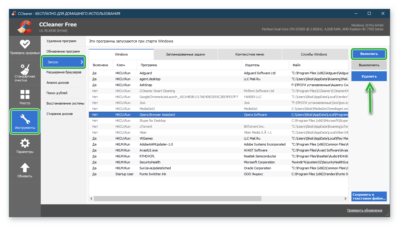 Для удаления вирусной задачи из автозагрузки нам поможет утилита CCleaner: