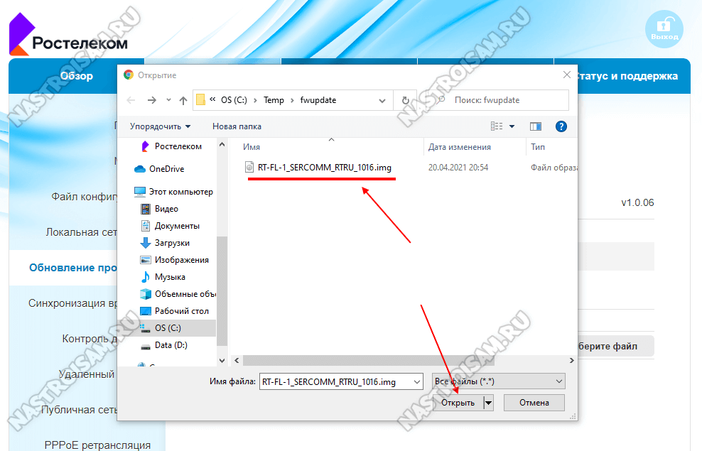 Появится окно проводника, в котором надо зайти в папку с загрузками и выбрать скаченный файл прошивки роутера Ростелеком. Нажмите кнопку «Открыть».