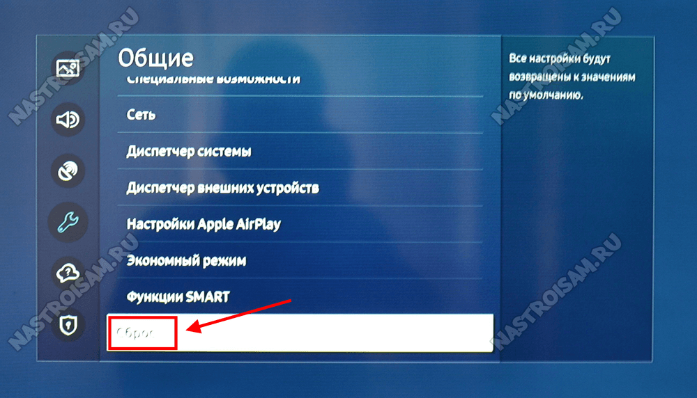 Прежде, чем приступить к столь решительным действиям, убедитесь, что телевизор прошел сертификацию для Российской Федерации. Если выполнить сброс настроек на ТВ без сертификата можно полностью заблокировать устройство.