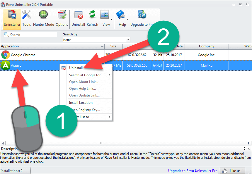 - Скачайте и установите на свой ПК программу Revo Uninstaller. Когда это будет сделано, запустите утилиту и выделите то приложение, которое нужно удалить, кликнув по нему правой клавишей мыши. Затем жмите кнопку, обозначенную цифрой 2.