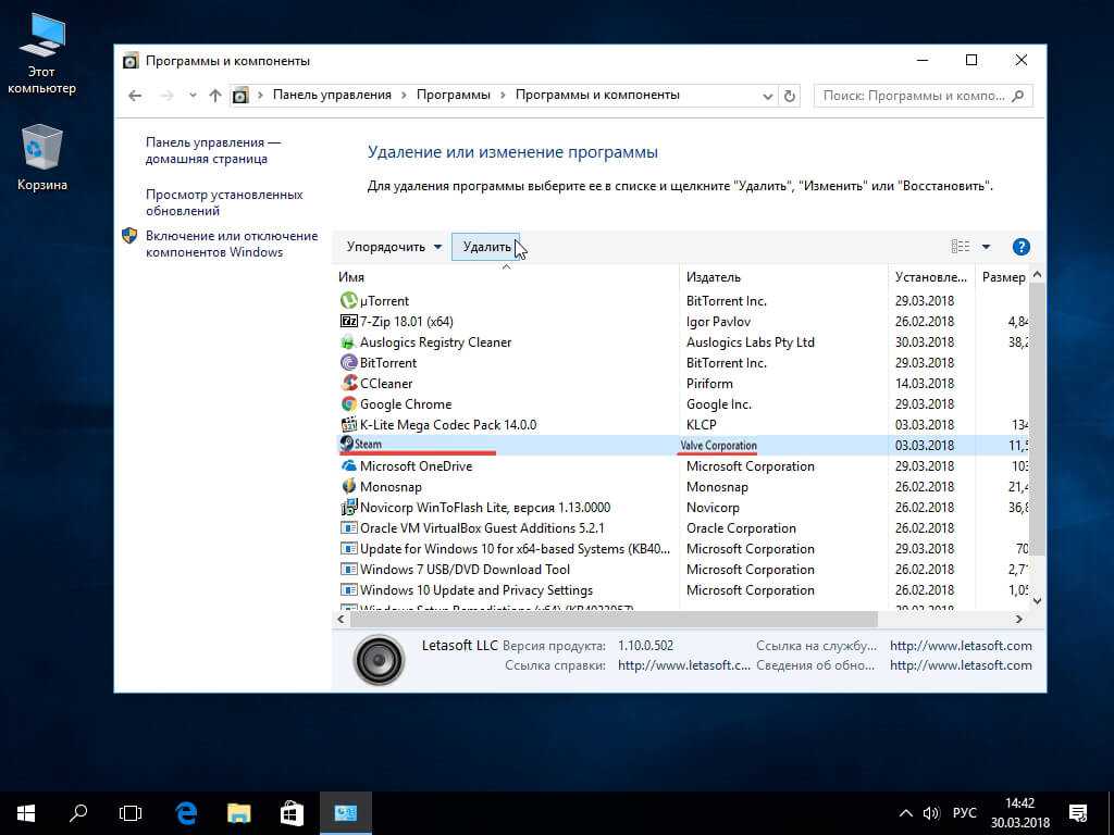 - Перейти в «Программы и компоненты», найти Steam, удалить стандартным методом.