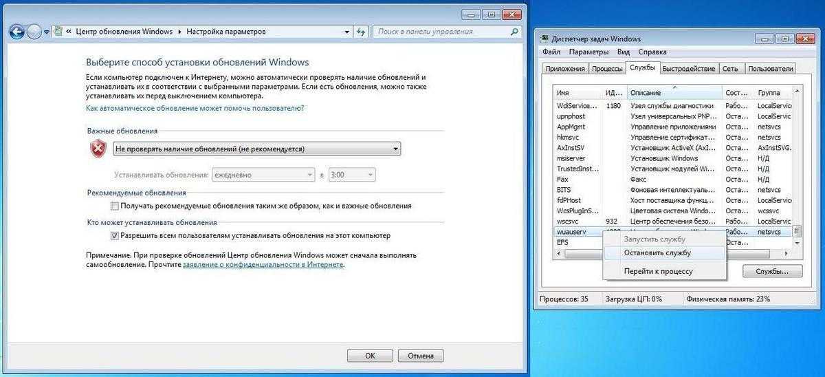 Системное приложение грузит память и процессор компьютера во время сбоев, которые возникают по вине автоматического обновления, регулярно подгружаемого из интернета на компьютер пользователя. Предпочтительно установить все Windows Update или отключить службу. Чтобы не получать больше обновлённые приложения, следует зайти в меню «Пуск», в «Панели управления» выбрать раздел «Система и Безопасность», а в нём — «Центр обновления Windows 7». На экране откроется окно с множеством параметров. Среди них необходимо найти категорию, отвечающую за настройку параметров, пользователь должен установить «галочку» напротив команды «Не проверять наличие обновлений».