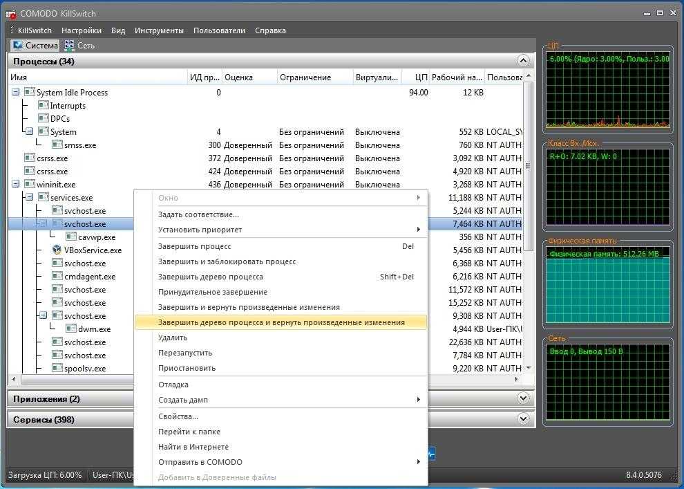 Также особенностью KillSwitch является проверка запущенных процессов на доверие. То есть, если процесс недоверенный, KillSwitch найдет его и укажет это в третьей колонке «Оценка». Эта особенность модуля KillSwitch поможет быстрее определить проблему, связанную с Svchost.exe и загрузкой процессора.