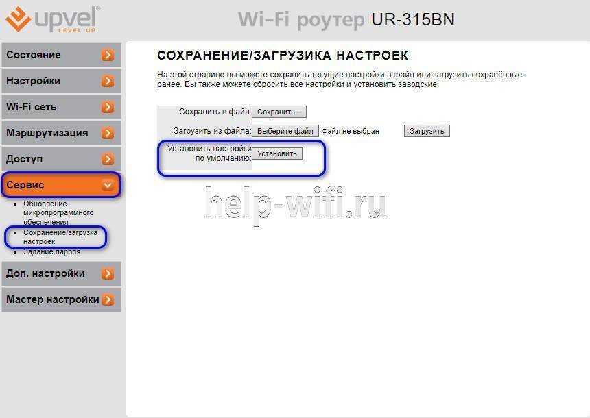 - Чтобы выполнить сброс заводских настроек UPVEL UR-315BN, нужно кликнуть «Установить» в поле «Установить настройки по умолчанию» и дождаться перезагрузки устройства.