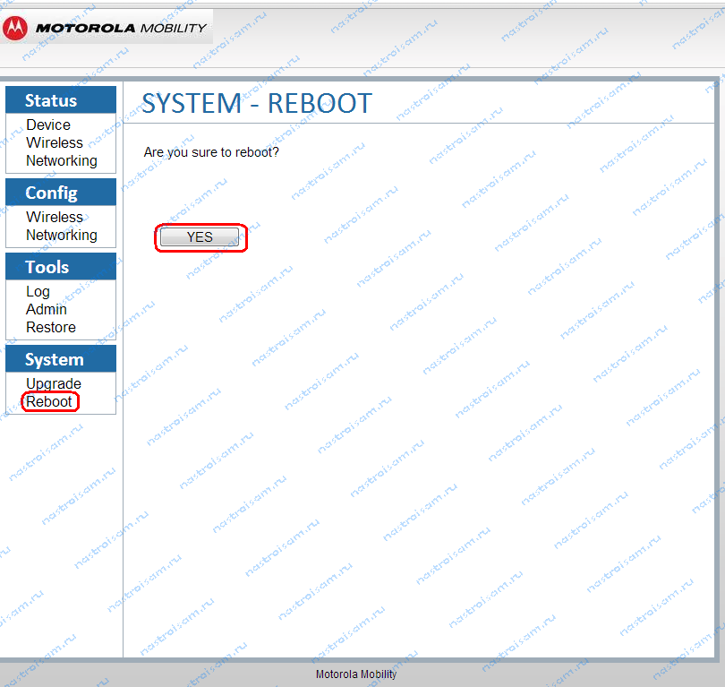 Здесь Вы можете при необходимости сменить или обновить прошивку Motorola VAP2400. Само-собой её надо сначала где-то скачать. Чтобы перезагрузить устройство из веб-интерфейса, надо зайти в раздел System -> Reboot: