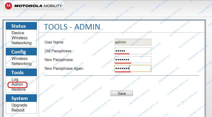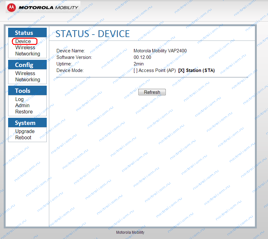 IP-адрес у Motorola VAP2400 в локальной сети — 192.168.1.100. Причем у обоих устройств одинаковый IP-адрес. Логин по-умолчанию admin, пароль так же — admin.