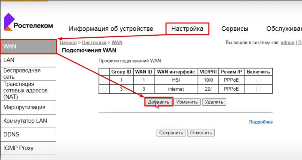 Перейдите в «Настройки», затем перейдите в «WAN». Там уже должно быть созданное ранее соединение. Если его нет, нажмите «Добавить». Если он уже существует, просто выберите его и нажмите «Изменить».