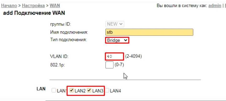 - Вводим любое имя, указываем тип коннекта как «Bridge» и вписываем VLAN ID из договора. В конце указываем LAN, к которому подключена приставка. У меня их две, поэтому я указал два порта. У вас скорее всего одна приставка. Подключите её к свободному порту и укажите его.