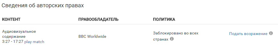 Прежде всего, нужно понять, правомерна ли блокировка. Нажмите на надпись «Видео заблокировано во всех странах» и посмотрите, кто правообладатель и на какой фрагмент видео он отправил претензию: