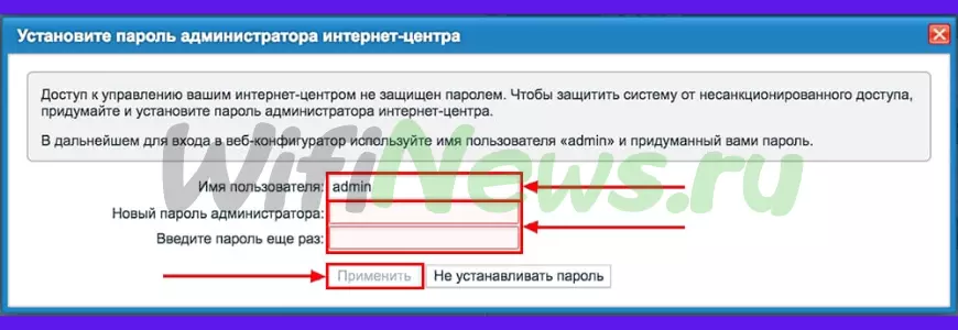 Затем роутер выводит окно для настроек паролей на web-интерфейс. По желанию, можно поставить пароль, а можно пропустить данную настройку. При установке пароля запомните и запишите пароль.