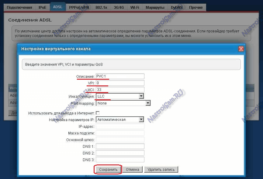 Для подключения DSL-соединения Вам надо открыть раздел Интернет => ADSL. В этом разделе надо создать PVC-канал. Для этого нажимаем кнопку Добавить. Откроется окно создания виртуального подключения: