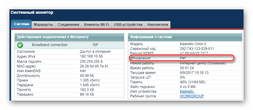 После этого вновь зайдите в панель администрирования Zyxel Keenetic и обратите внимание на версию установленной прошивки для того, чтобы убедиться в том, что процесс обновления прошел успешно