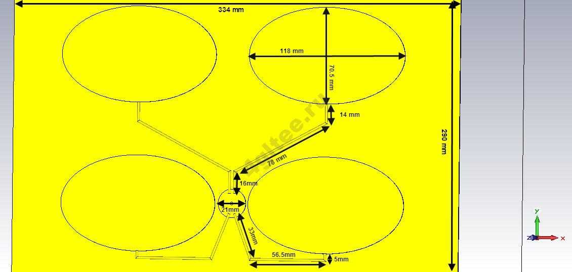 Частота 2,6 ГГц, длина волны 115,3 мм. Сторона квадрата составит четверть длины волны: 28,82. Для получения общей длины восьмерки умножаем одну сторону на 8, получается 230,6 мм. Берем запас, получается 235 мм. Расстояние до рефлектора составит 0,15 – 0,2 длины волны. Берем нечто среднее – 0,175. Получается 20,2 мм.