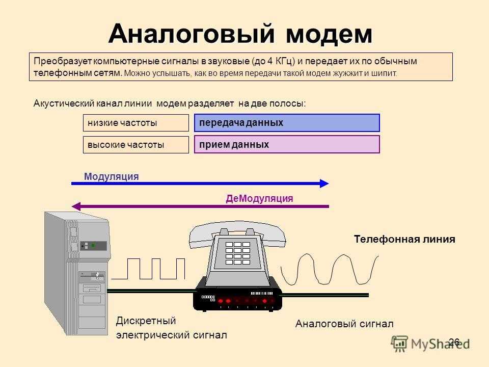 Благодаря модуляции и демодуляции, потоки данных могут перемещаться к вашему дому или офисному модему и обратно к ISP и обратно. Модуляция — это преобразование цифровых данных в аналоговые сигналы. Это делается на передающем конце соединения или там, откуда посылается сигнал. Этот процесс преобразования аналоговых сигналов в цифровые также называется процессом оцифровки данных. Демодуляция — это преобразование аналоговых данных в цифровые, которые могут быть использованы или проанализированы. Этот процесс происходит на приемном конце линии передачи данных. Устройства, осуществляющие модуляцию, называются модуляторами, а компоненты, способные демодулировать сигналы, называются демодуляторами.