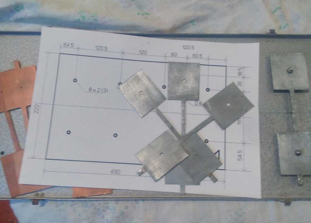 Экран сооружается в форме прямоугольника с габаритами 490×222×20, на его плоскости следует выполнить точную разметку положения панелей антенны. В местах их крепления сверлятся отверстия