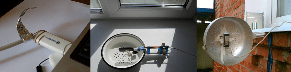 Это простейший вариант усилителя сигнала, он собирается из медной проволоки, железной бытовой посуды и USB-удлинителя подключения модема. Медь в несколько витков оборачивается вокруг принимающего устройства, что уже усилит сигнал. Для подбора же точного количества витков и длины свободного отрезка проволоки понадобятся более доскональное знание технологии с учётом особенностей местности, однако рекомендуется, чтобы и кабель и проволока были как можно короче. Желательно чтобы модем был закреплён в ёмкости параллельно её днищу. В качестве посуды подойдут и консервные банки.