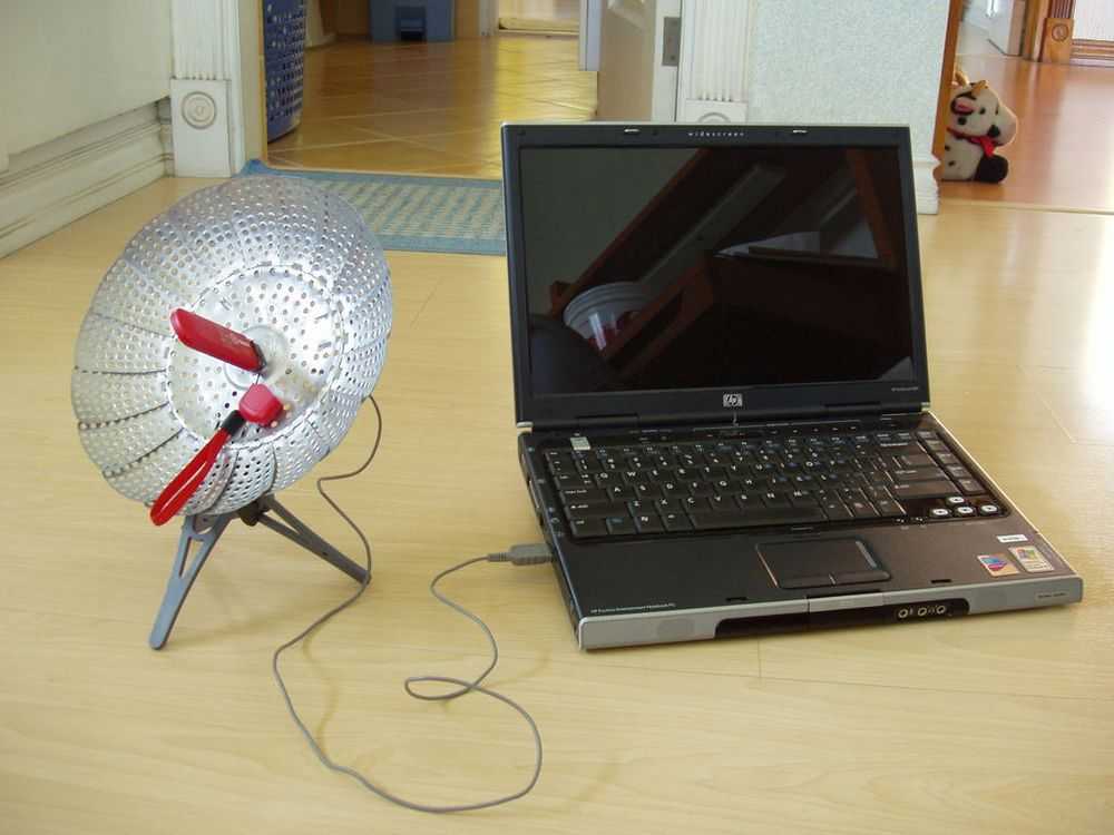 - Применение спутниковой антенны. Чтобы создать из спутниковой тарелки антенну, нужно в центре дуршлага высверлить небольшое отверстие. Закрепить его на место облучателя, используя винт или болт с двумя шайбами. От центра отступаем примерно пять сантиметров и высверливаем еще отверстие. В него вставляем вино, на него будет надета резиновая втулка. Посредством скотча (можно использовать изоленту) на втулке прикрепляется беспроводной маршрутизатор. Чтобы подключить модемное устройство к размещенному внутри дома ПК или ноутбуку, применяем ЮСБ удлинитель.